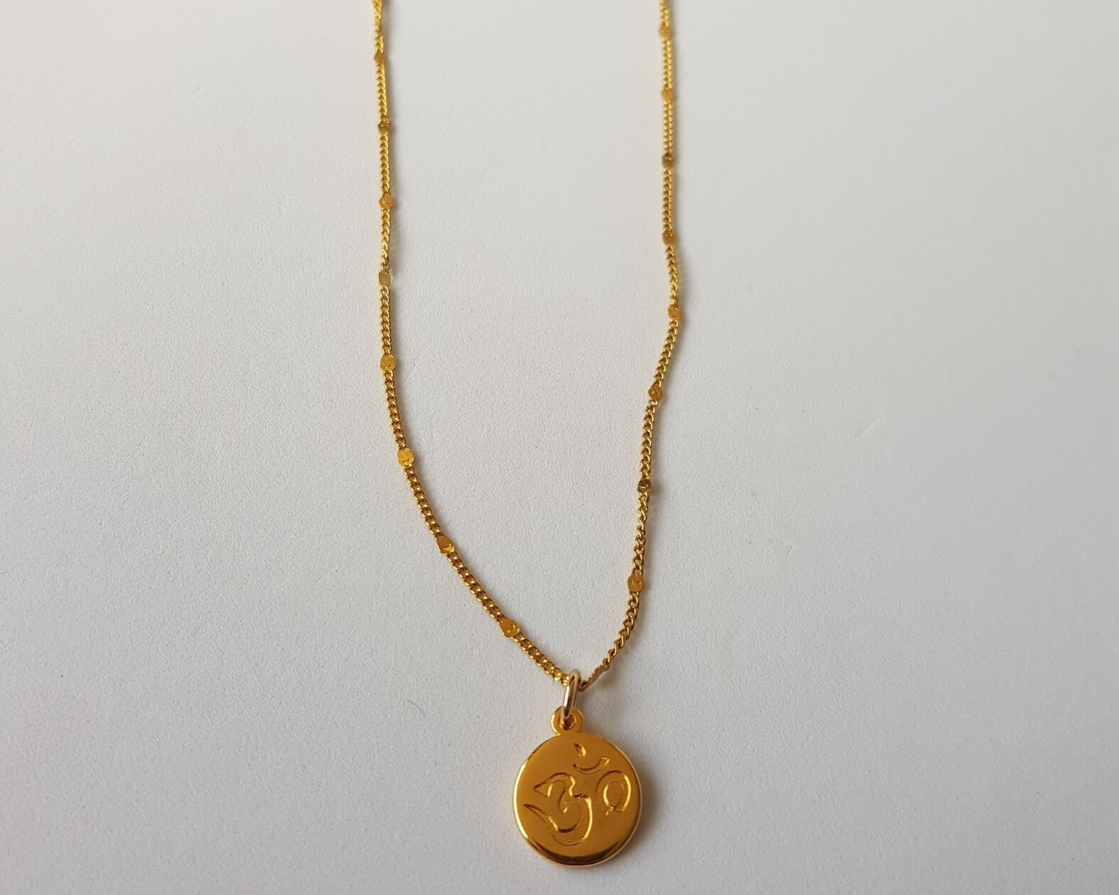 Roestvrij stalen goudkleurige ketting met een ohm hanger. Dit symbool staat voor volmaaktheid. Tevens staat het voor de schepping van het heelal, die door de oerenergie gemaakt is. Het staat ook hiermee ook voor Brahma, Vishnu en Shiva.