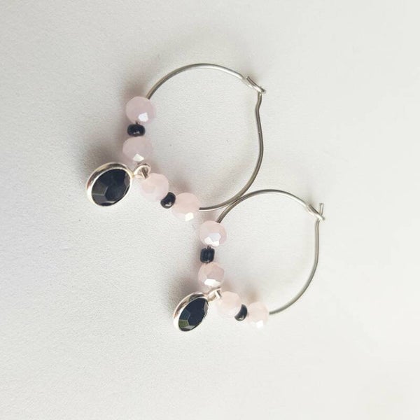 Handgemaakte zilverkleurige oorbellen met zwarte kralen en een crystal glas hanger. Ook beschikbaar met roze kralen gecombineerd met zwart.