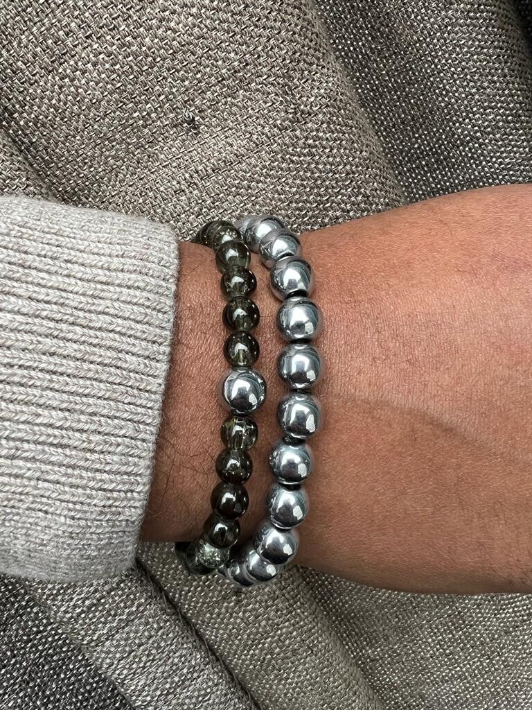 Handgemaakte heren armband met zilverkleurige en 2 groene kralen. Goed te combineren met de andere armbanden uit de collectie en je eigen horloge! De armband is gemaakt van elastiek en heeft hierdoor een groot pasbereik.