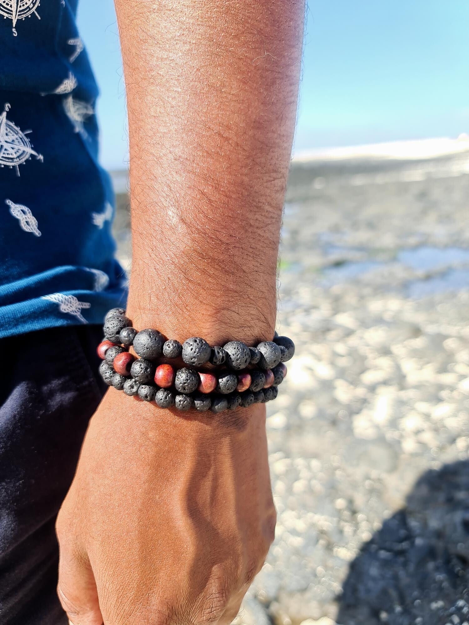 Stoere armband met zwart en rode kralen. Goed te combineren met andere armbanden en horloges.